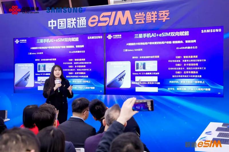 在联通方案解读环节,中国联通e补合作专家围绕“AI+eSIM”融合趋势,阐述了联通在eSIM技术适配、网络保障及权益创新方面的全面布局,并发布了针对Galaxy S26系列用户的专属“e补”权益政策。中国联通为此次首销量身打造eSIM专属权益:用户购买三星Galaxy S26系列并开通联通eSIM业务,即可获赠200GB全国通用流量年包及相应联通文创。