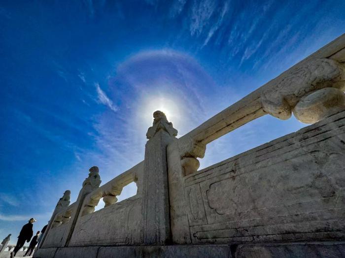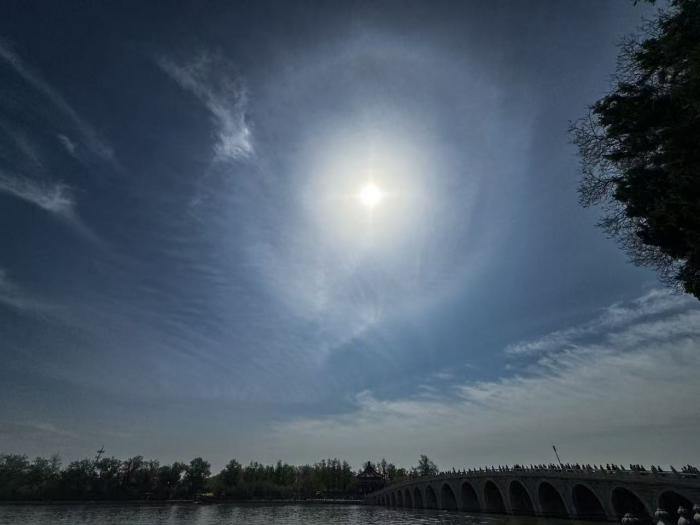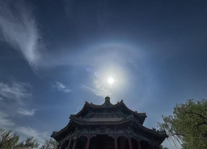 当日,颐和园天气晴好,阳光透过高空卷层云,经冰晶折射反射,在太阳周围形成直径约22度的光环。