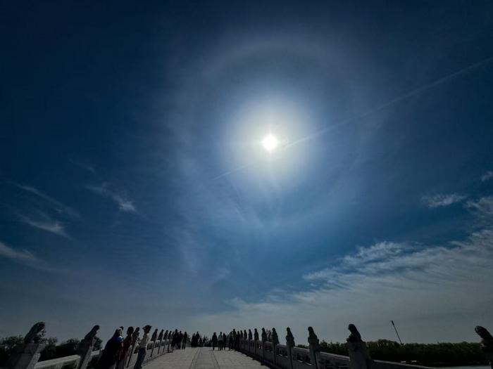 4月21日上午,北京颐和园上空出现日晕景观,一道明亮的白色光环围绕太阳缓缓晕开,与园内古建、蓝天相映成趣,引得游人纷纷驻足拍摄。