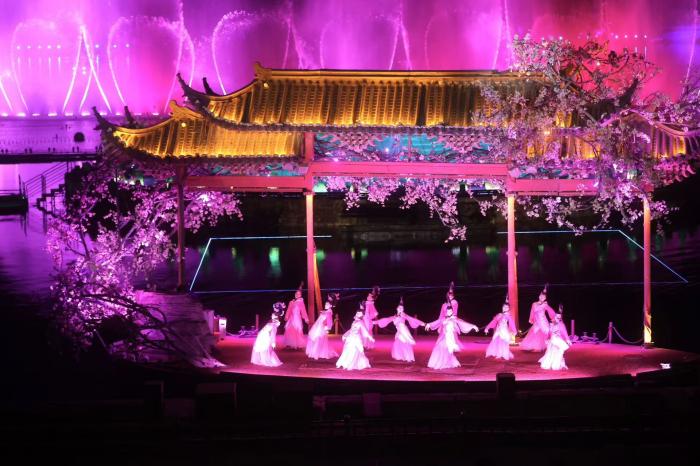 而夜幕降临时,《天汉传奇》水上实景秀惊艳登场,3000㎡巨型全息水幕、绚烂灯光与璀璨烟花交织,以汉水神女传说为线,勾勒大汉盛世气象,带来极致视听盛宴。