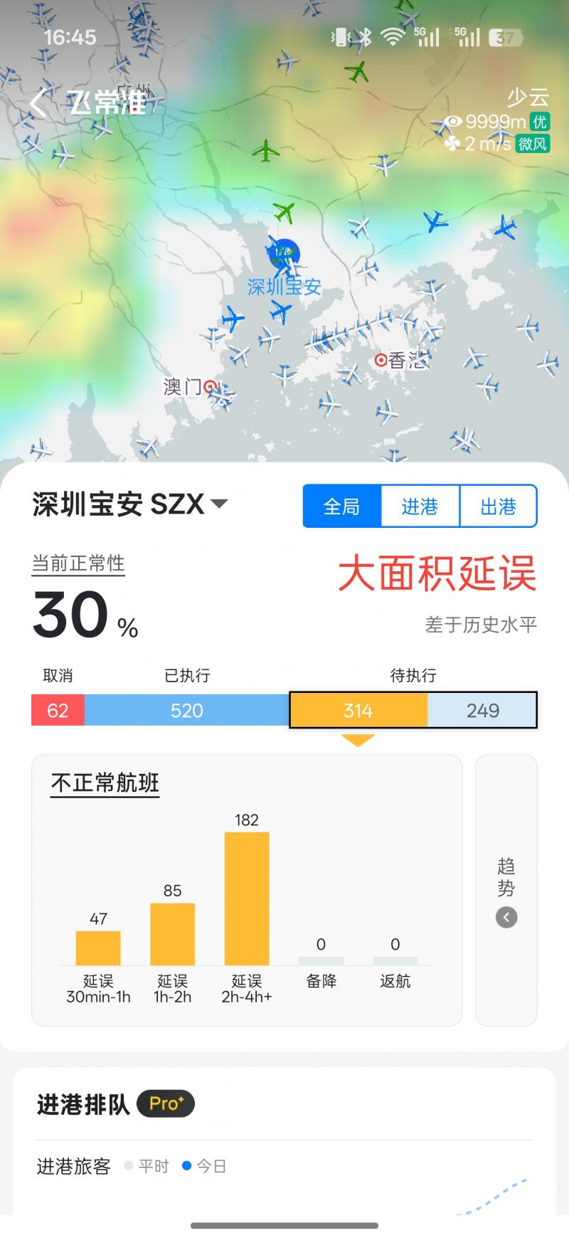 截至4月23日16:45 ,据飞常准APP显示,当前深圳宝安机场大面积延误,延误进出港航班超300架次,其中延误两小时以上进出港航班超180架次。广州白云机场现已解除大面积航班延误应急处置响应,当前小面积延误,延误进出港航班超260架次。