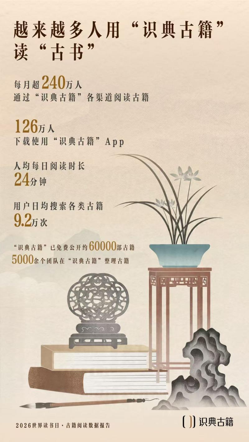 4月23日,第31个世界读书日当天,“识典古籍”正式发布《古籍阅读数据报告》。报告显示,平台月均读者超240万人,人均每日阅读24分钟,近6万部免费公开古籍,正借助AI技术从专业书斋走向大众日常,让千年文脉在数字时代持续流淌、焕发新生。
