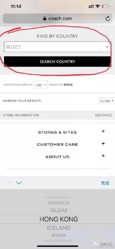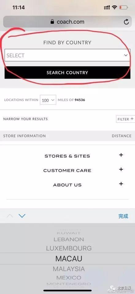 此外,在Coach官网上搜索门店时,其显示为find by country(按国家查找),在下拉栏中赫然显示着香港,澳门和台湾三个地名,并与中国和美国等国家并列。