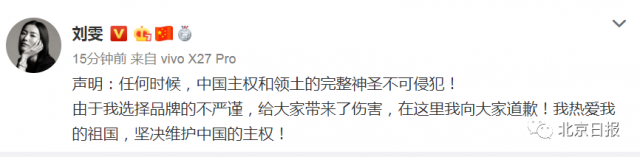 刘雯称:任何时候,中国主权和领土的完整神圣不可侵犯!由于我选择品牌的不严谨,给大家带来了伤害,在这里我向大家道歉! 我热爱我的祖国,坚决维护中国的主权!