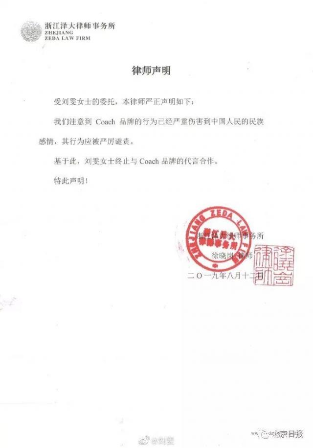 就在Coach官方尚未作出回应之际,身为Coach代言人的刘雯在其微博上发表了声明:将终止与Coach的合作。