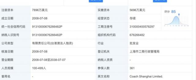 天眼查数据显示,蔻驰贸易(上海)有限公司成立于2008年7月,注册资本7896万美元,法定代表人YANN FABIEN BOZEC,公司类型为有限责任公司(台港澳法人独资),由COACH HONG KONG LIMITED100%控股,公司经营范围包括钟表、箱包、皮革制品、服装及其饰品、鞋帽等。