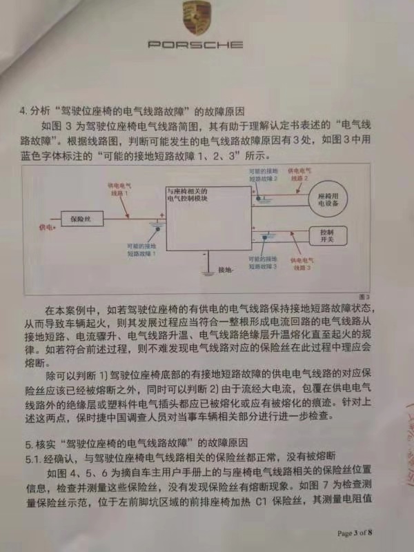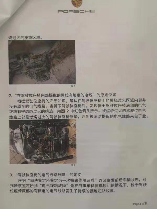 广东省鹤山市消防大队调查认定,起火原因为电气线路故障引燃。但保时捷中国公司的调查报告却称,在易先生的座位底下找到了一个疑似打火机配件的金属残片,他们认为起火与车辆本身无关。