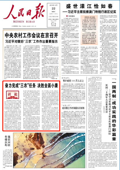 明年“三农”工作重点任务已定,让我们更加紧密地团结在以习近平同志为核心的党中央周围,凝心聚力,狠抓落实,攻坚克难,奋力夺取全面建成小康社会伟大胜利。(人民日报)