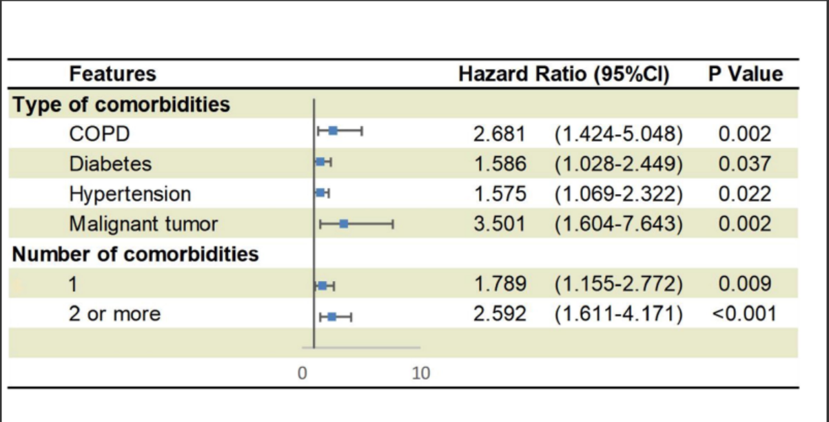 与没有合并症的患者相比,患至少一种合并症的患者的HR为1.79(95%CI为1.16-2.77),而患有两种或两种以上合并症的患者HR为2.59(95%CI为1.61-4.17)。这意味着,只要有一种合并症发生,就与患者的不良预后风险率升高79%有关,同时有两种以上的话,风险率会升高1.59倍。