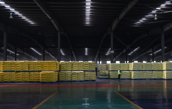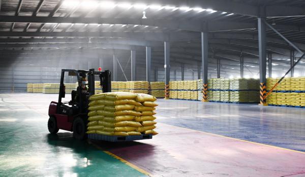 湖北宜化松滋肥业有限公司包装车间待外运的磷肥成品(3月20日摄)。