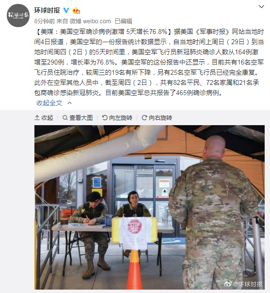 美媒:美国空军确诊病例激增 5天增长76.8%