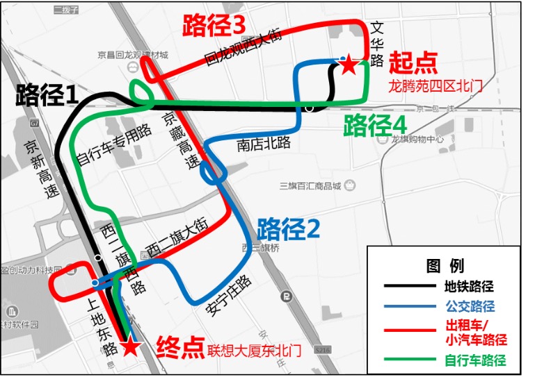 通过分组出行体验,回龙观与上地软件园之间,自行车出行用时最短,为45分钟;出行费用最低,为0元。相比同时段其他交通方式,公交用时达90分钟,出租车66分钟,小汽车为50分钟,地铁用时45分钟。自行车出行是回龙观与上地软件园之间最便捷、性价比最高的出行选择。