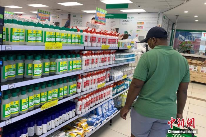 资料图:南非约翰内斯堡一药店内,顾客正在挑选防疫物资