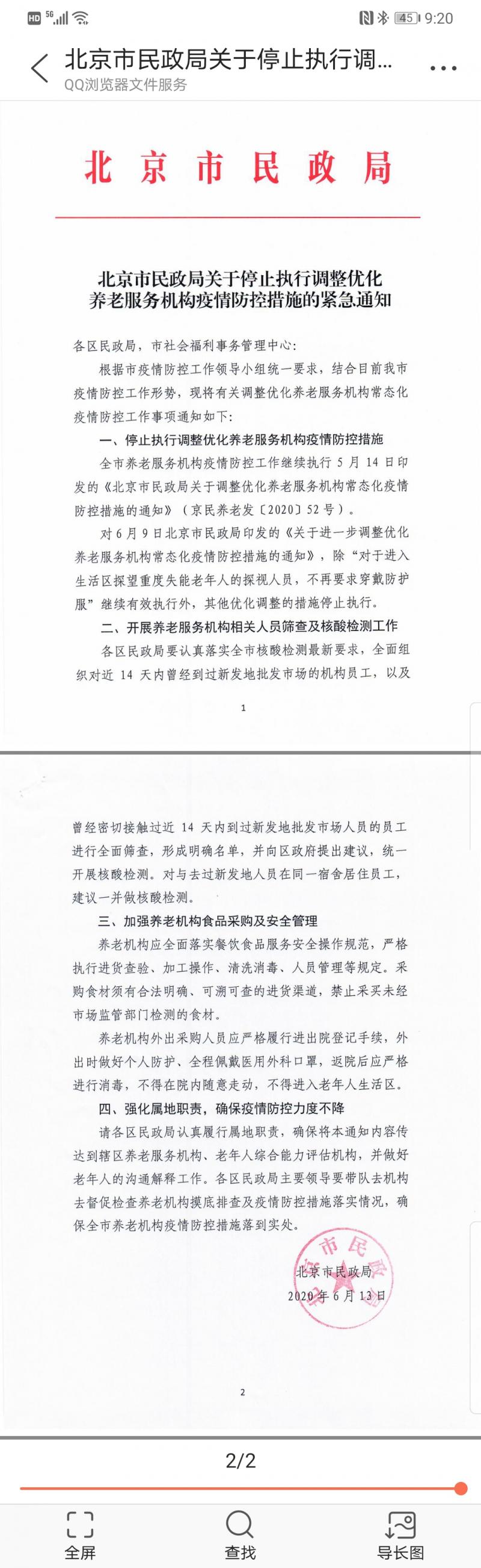 6月15日上午,北京市民政局正式发布消息,根据市疫情防控工作领导小组统一要求,结合目前本市疫情防控工作形势,北京市民政局停止执行调整优化养老服务机构疫情防控措施,继续执行二级响应期间养老服务机构疫情防控政策