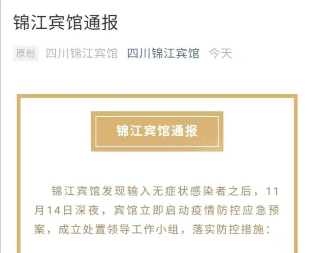 11月16日,四川锦江宾馆发布通报,宾馆于14日发现输入无症状感染者,现在暂停一切经营活动,全馆封控管理。一天前,15日,成都市报告1例境外输入无症状感染者轨迹,引发关注。该感染者曾就住四川锦江宾馆。