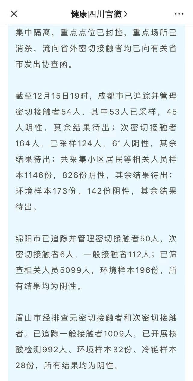 眉山市经排查无密切接触者和次密切接触者;已追踪一般接触者1009人,已开展核酸检测992人、环境样本32份、冷链样本28份,所有结果均为阴性。
