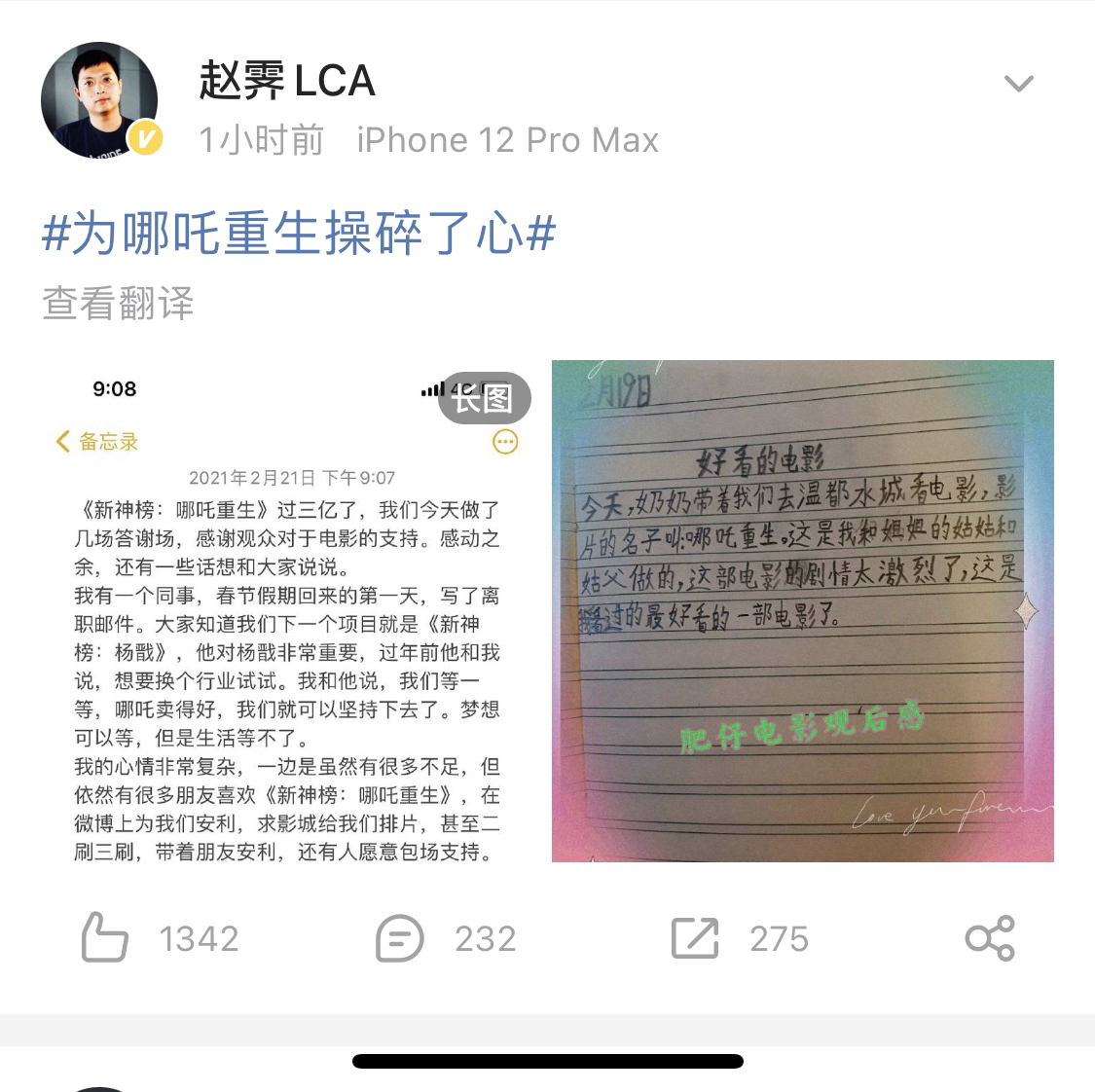 晚间,他也发长文表示,哪吒是整个新封神系列的开启,下一个项目就是《新神榜:杨戬》,“哪吒卖得好,我们就可以坚持下去了。”
