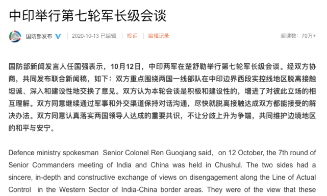 从2020年9月21日中印两军举行的第六轮军长级会谈到2021年2月20日的第十轮军长级会谈,中方都是在会谈后发布“联合新闻稿”,并在新闻稿中说明,这是“经双方协商,共同发布”。