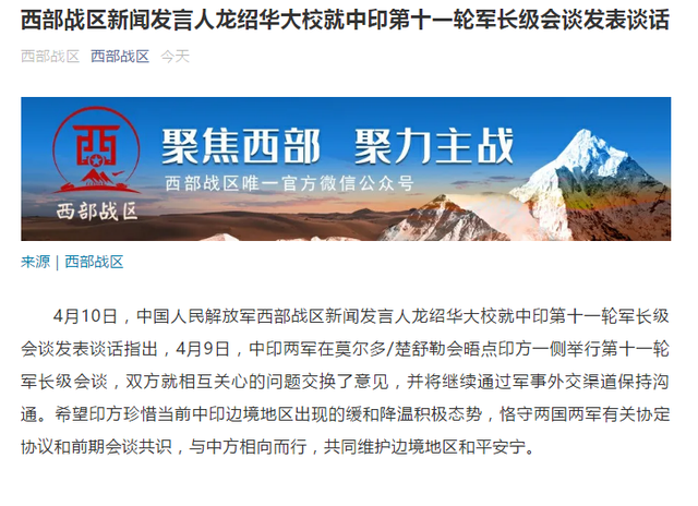 据微信公众号“西部战区”4月10日消息,中国人民解放军西部战区新闻发言人龙绍华大校就中印第十一轮军长级会谈发表谈话。