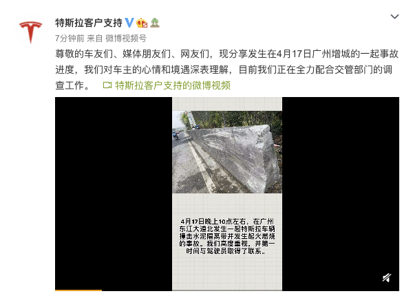 4月24日下午,@特斯拉客户支持 微博通报发生在4月17日广州增城的一起事故进度:我们对车主的心情和境遇深表理解,目前我们正在全力配合交管部门的调查工作。