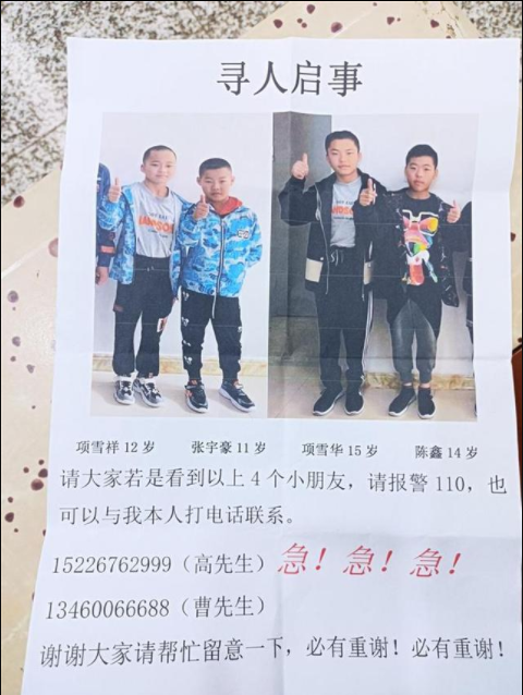 6日下午,极目新闻记者采访时,帮助搜寻的救援人员和民警告诉记者,5月1日晚上,4个孩子是从成华区的民兴西苑出走的,在成都表演期间,4个孩子就住在该小区。出走之后,4个孩子分成了两波,陈鑫和项雪华一起出走,年龄小的张宇豪和项雪祥则在一起。