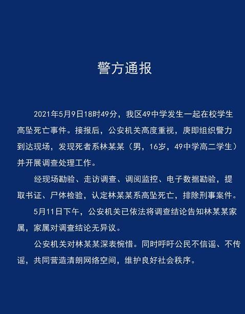 近日,成都49中学一学生坠亡,引发网友关注。5月11日晚,成都市公安局成华区分局发布警方通报称,认定林某某系高坠死亡,排除刑事案件。5月11日下午,公安机关已依法将调查结论告知林某某家属,家属对调查结论无异议。