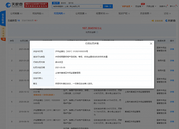 据天眼查APP显示,近日,HM关联公司海恩斯莫里斯(上海)商业有限公司新增一条行政处罚信息,处罚事由为未标明需要标明产品规格、等级、所含主要成份的名称和含量,处罚结果为责令改正,处罚单位为上海市黄浦区市场监督管理局。