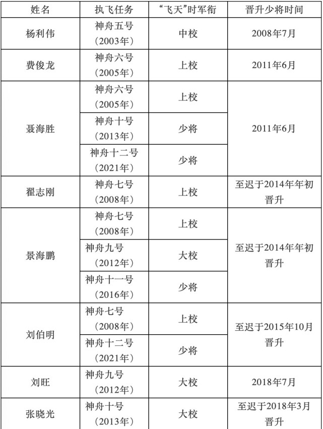 公开报道显示,在12名航天员中,已有8人晋升少将。