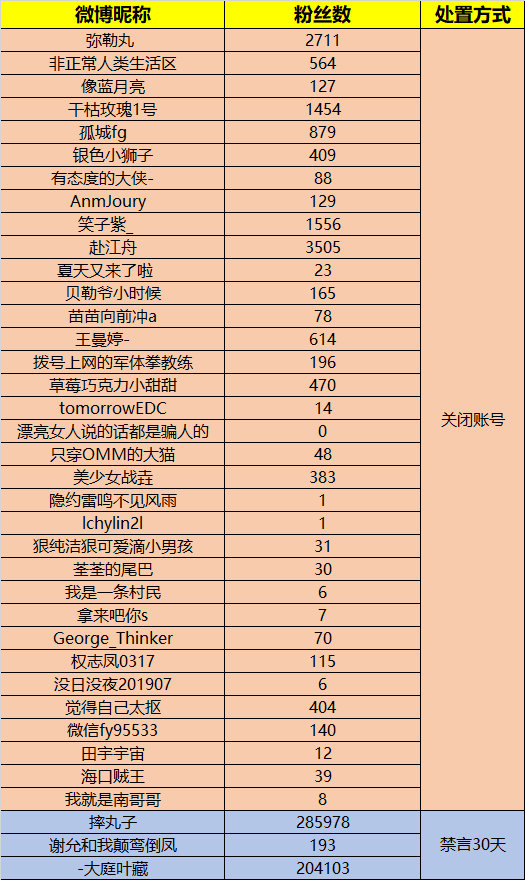 现根据《微博社区公约》等有关社区规则对账号 @弥勒丸 等37个账号给予禁言直至关闭账号的处罚。