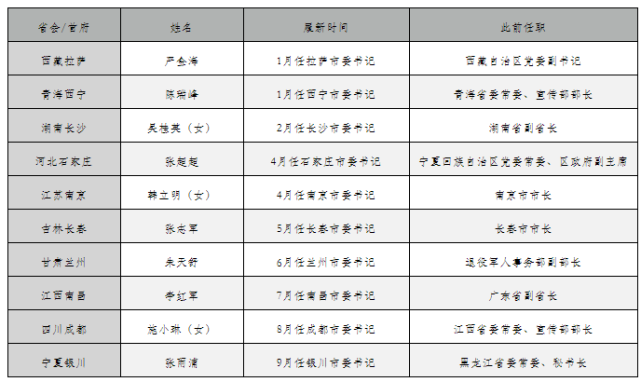 政知君注意到,27个省会/首府“一把手”中,至少有10个城市的党委书记都是今年履新的,这10个地方分别是西藏拉萨、宁夏银川、吉林长春、江苏南京、江西南昌、湖南长沙、青海西宁、河北石家庄、甘肃兰州、四川成都。