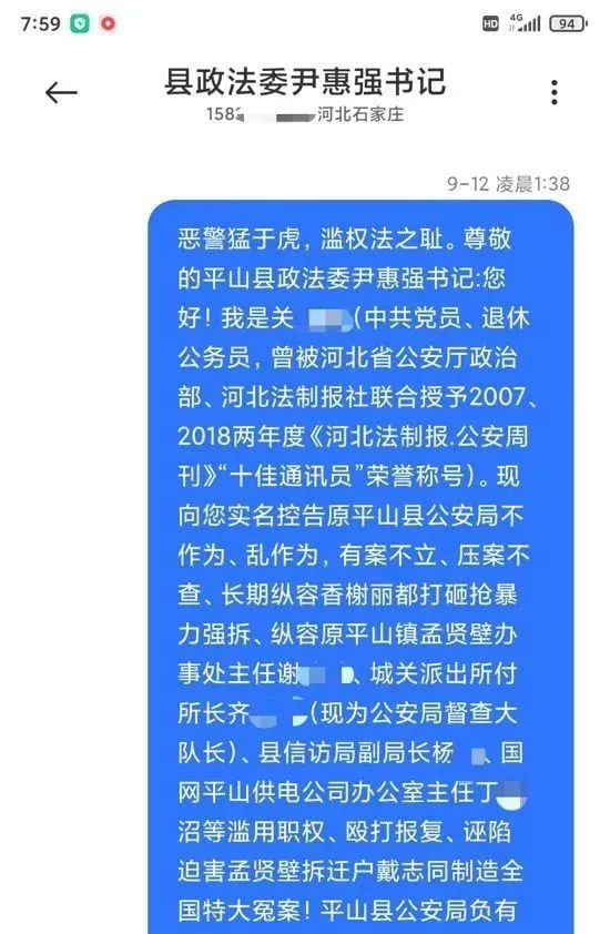 短信内容显示,9月12日凌晨1点38分,关翠敏实名向“平山县政法委书记尹惠强”举报原平山县公安局不作为、长期纵容有关人员暴力强拆等问题。当日上午8点5分,平山县政法委书记尹惠强向举报者回复“滚”。