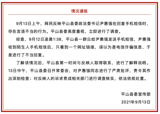 9月13日中午,平山县委召开常委会,对尹惠强同志进行了严肃批评,责令其作出深刻检查;对反映人的诉求责成相关部门进行调查核实,依法依规处置。