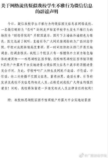 广西财经学院认为,相关图文混清了视听,直接引导广大网民猜测指向为广西财经学院。广西财经学院表示,学校对此则舆情高度重,第一时间组织相关部门开展实地调查。经调查核实,该校三个校区只有一栋楼体外立面为银色墙体的建筑物——相思湖校区图书馆。该校相思湖校区图书馆顶楼9层的户外露天平台实地场景与微信图文信息中展示的顶楼场景完全不同。为此,学校呼吁广大师生及网民不造谣,不传谣,不信谣,勿二次传播不实图文信息。