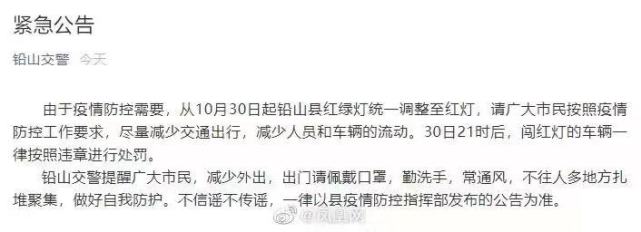据江西省卫健委消息,10月30日,铅山县葛仙山镇发现一名核酸检测阳性人员,系葛仙村度假区工作人员。当日,“铅山交警”微信公众号发布公告称,由于疫情防控需要,从10月30日起铅山县红绿灯统一调整至红灯,请广大市民按照疫情防控工作要求,尽量减少交通出行,减少人员和车辆的流动。30日21时后,闯红灯的车辆一律按照违章进行处罚。