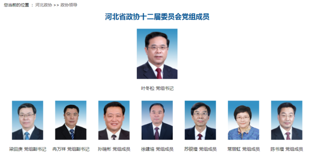 据河北省政协官网介绍,河北省政协主席、党组书记是叶冬松,党组副书记是梁田庚、冉万祥。党组成员还包括孙瑞彬、徐建培、苏银增、常丽虹和陈书增。