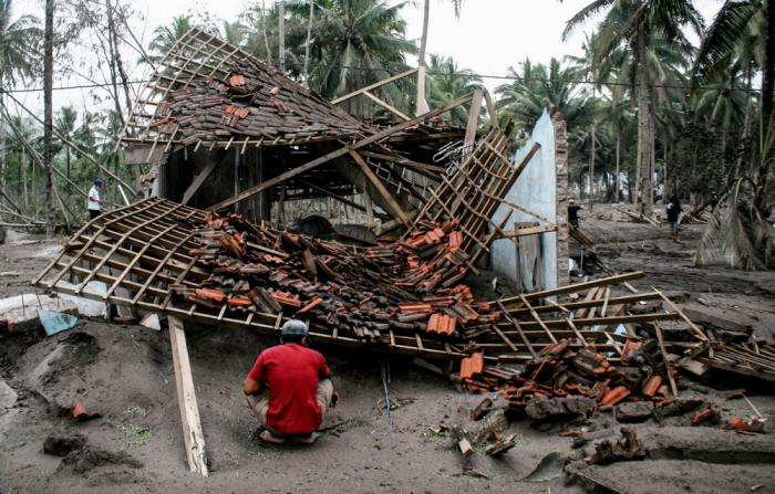 12月6日,在印度尼西亚东爪哇省卢马姜,一名男子坐在倒塌的房屋前。