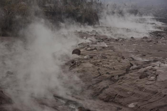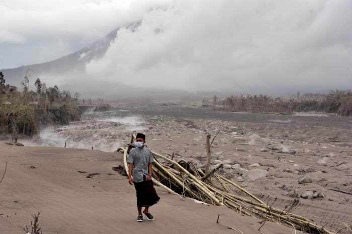 12月6日,在印度尼西亚东爪哇省卢马姜,一名男子走在被火山灰覆盖的河流边。