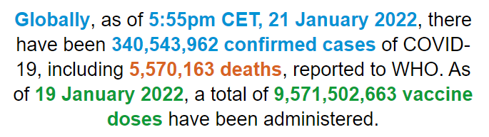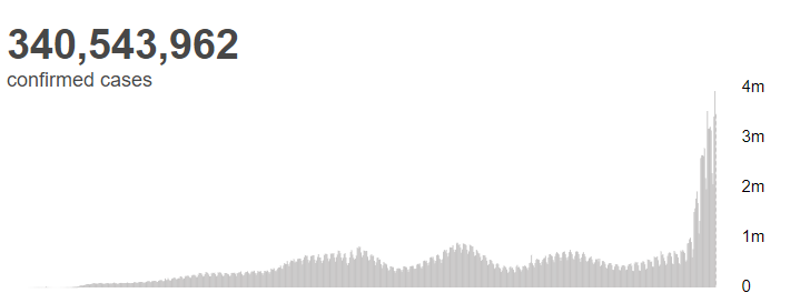 根据世卫组织最新实时统计数据,截至欧洲中部时间1月21日17时55分(北京时间1月22日0时55分),全球累计新冠肺炎确诊病例340543962例,累计死亡病例5570163例;21日全球新冠肺炎确诊病例新增3472227例,死亡病例新增9184例。