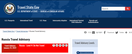 美国务院当地时间23日发布“俄罗斯旅游咨询”通告称,“鉴于俄乌边境局势持续紧张,美国公民可能受到骚扰,大使馆在俄协助美国公民的能力有限,新冠疫情和相关入境限制,恐怖主义,俄罗斯政府安全官员的骚扰,以及当地法律的任意执行,请不要前往俄罗斯。”