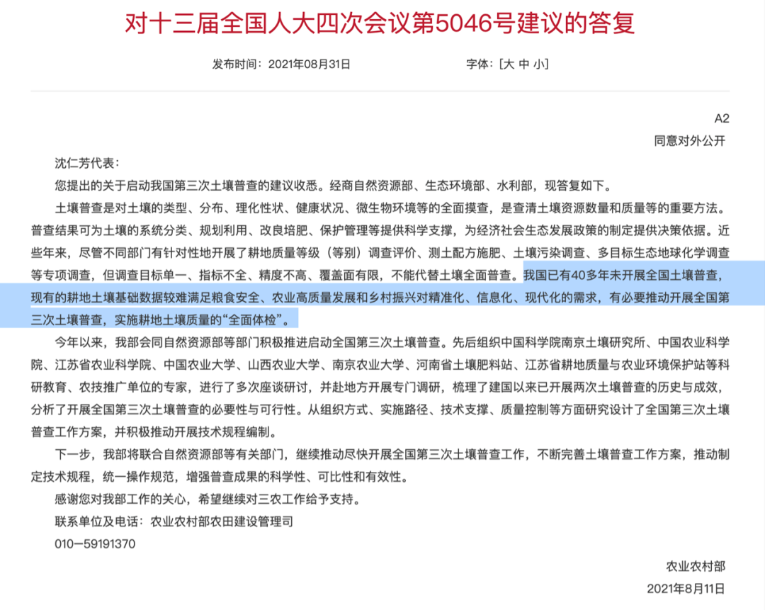 在2021年4月,农业农村部农田建设管理司一级巡视员陈章全曾对媒体介绍,自第二次全国土壤普查以来,我国约40年未开展土壤普查,原有数据已不能准确反映当前耕地质量状况,难以适应精准管理需求。