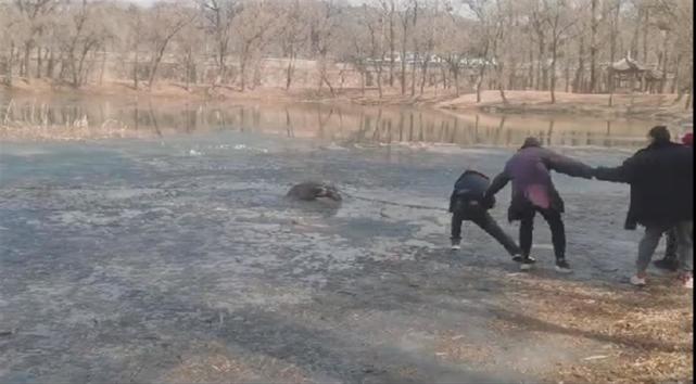小鹿掉进冰湖众人搭“人链”救援,目击者:用打捞网勾住了鹿角