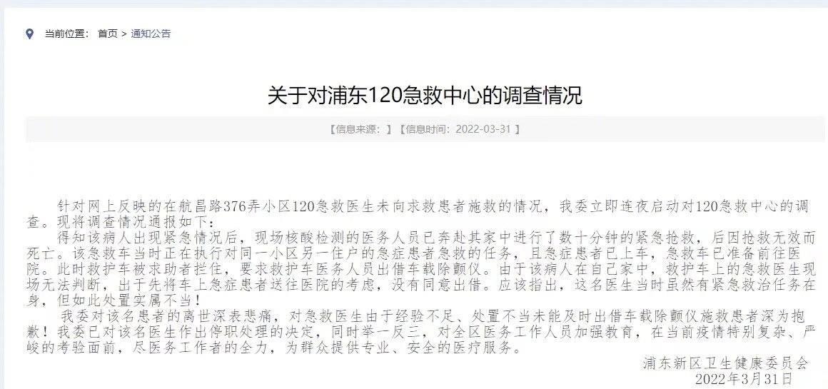 3月31日,针对网上反映的在航昌路376弄小区120急救医生未向求救患者施救的情况,上海市浦东新区卫生健康委员会立即连夜启动对120急救中心的调查。现将调查情况通报如下:
