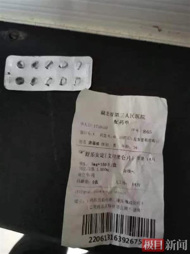 民警发现,该男子的包里有一张安眠药配药单和一张安眠药包装壳,10粒安眠药都已被小伙吃完。民警立即拨打120,急救车赶来将小伙子送到武汉市三医院。经救治,这名姓唐的小伙子脱离生命危险。