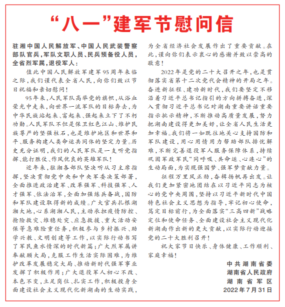 值得一说的是,除了省委书记、省长分头走访慰问,7月31日,湖南还以“省委、省政府、省军区”名义公开发表了一封“八一”建军节慰问信。