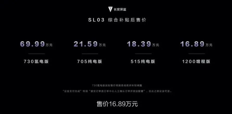 长安深蓝SL03售价SL03增程版售价16.89万元,纯电版售价18.39万元起,氢电版售价69.99万。因为长安深蓝SL03氢电版车型是中国首款量产的氢燃料电池轿车,所以氢电版更多的是一种象征实力的意义,消费者更关注的是SL03的增程版与纯电版车型。