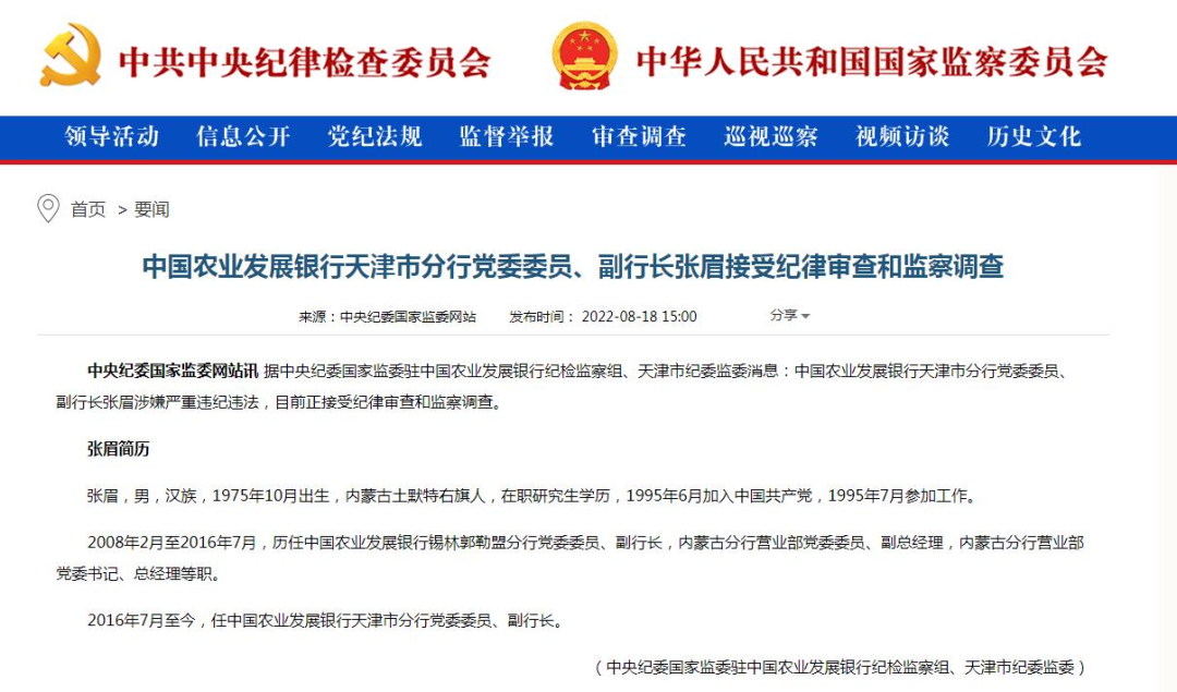 8月18日,据中央纪委国家监委驻中国农业发展银行纪检监察组、天津市纪委监委消息:中国农业发展银行天津市分行党委委员、副行长张眉涉嫌严重违纪违法,目前正接受纪律审查和监察调查。