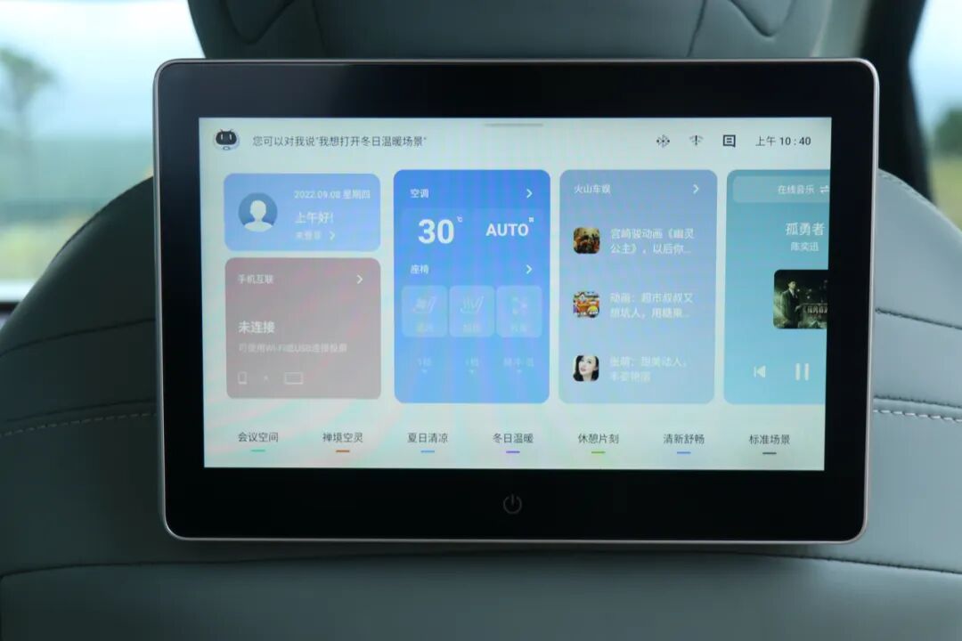 扶手上的屏幕除了控制座椅功能调节外,还支持变换7种模不同模式,例如“小憩模式”启动,座椅即刻切换角度,关灯、关窗,保持25℃恒温等,仿佛置身VIP休息室;在夏季开启“清凉模式”,关窗、调低空调温度、开启座椅通风等。