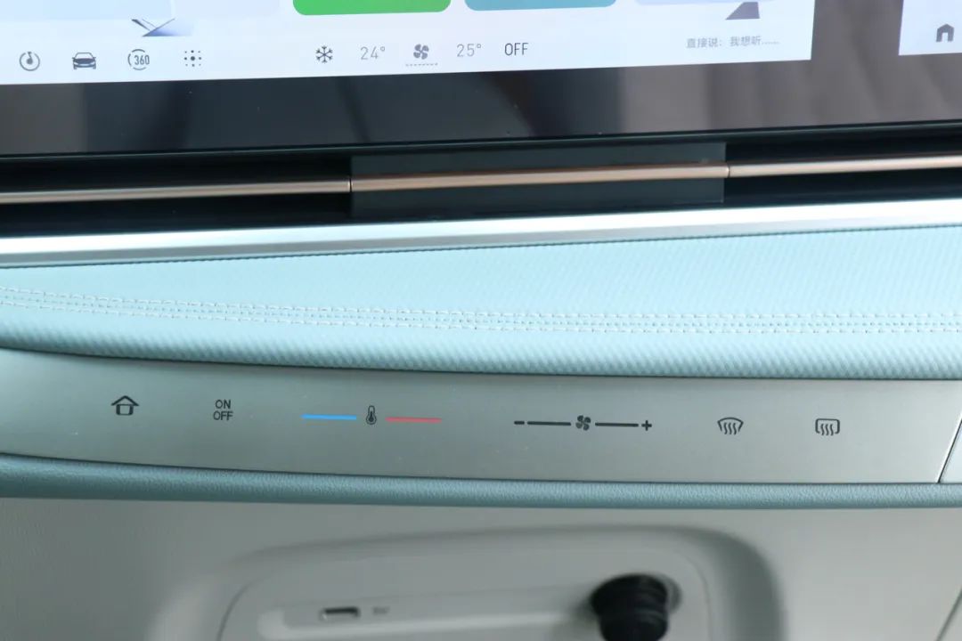 空调操作区域没有物理按键,采用触控式常驻快捷操作栏设计,除了点按外还可支持滑动操作,且能实现盲操作。