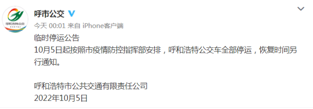 10月5日,呼市公交微博发布临时停运公告称,呼和浩特市公交车全部停运。