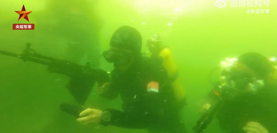 水下,携带武器和氧气罐的蛙人隐蔽潜进。